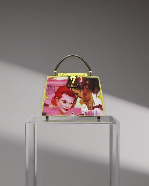 งานเย็บปักนับพันที่รังสรรค์ตามฝีแปรงจากภาพวาดในปี 2021 ของศิลปินสะท้อนให้เห็นถึงความเชี่ยวชาญด้านงานฝีมือที่เป็นเอกลักษณ์ ผลงาน Tenderness ถูกนำมาพิมพ์ลายอย่างพิถีพิถันบนองค์ประกอบด้านหน้าในเฉดสีสดใสเพื่อชูจุดเด่นในความลุ่มลึกของกระเป๋า ขั้นตอนนี้ได้มีการทำซ้ำแบบเดียวกันในองค์ประกอบด้านหลังเพื่อถ่ายทอดพาเลตต์สีแบบคาไลโดสโคปภายใต้การนำเสนอผลงานที่เปี่ยมด้วยแนวคิดของการเริ่มต้นใหม่อย่างต่อเนื่อง "ผลงานนี้เกิดจากซีรีส์ภาพวาดที่มีชื่อว่า ‘sentimental’ ซึ่งวาดขึ้นจากจุดกำเนิดเชิงประติมานวิทยาของภาพโฆษณาจากช่วงปี 1950" - Ida Tursic และ Wilfried Mille