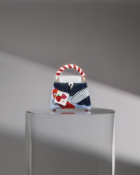 กระเป๋า Capucines ใบเล็กของ Wang ในรูปแบบของ Artycapucines ขนาดเล็กที่สุดที่เป็นการนำผลงานที่เป็นเอกลักษณ์ของเมซงมาออกแบบใหม่อย่างมีลูกเล่นผ่านเลนส์คาไลโดสโคปผสมผสานลวดลายกราฟิกอันชวนให้นึกถึงลาย Damier สุดไอคอนิกเข้ากับการตกแต่งที่เปี่ยมด้วยสีสันสดใสซึ่งสะท้อนออกมาผ่านการรังสรรค์ผลงานที่แปลกใหม่ราวกับห่อลูกกวาดและขนมหวานที่ชวนให้ลิ้มลอง