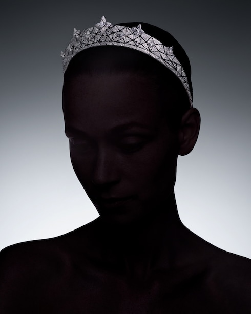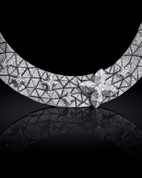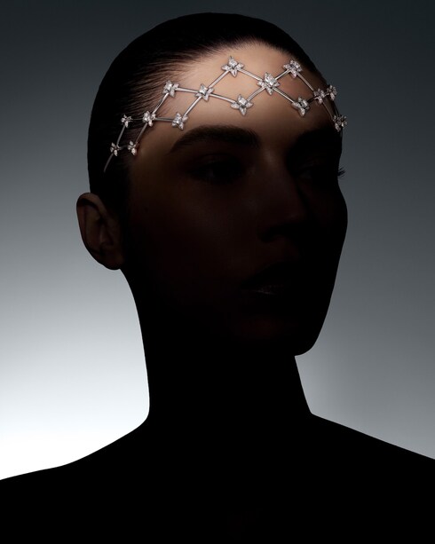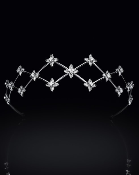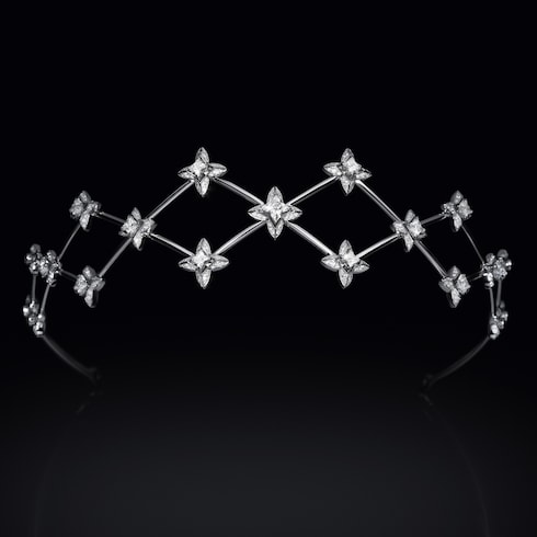 Élégance สื่อถึงการสดุดีแด่ศิลปะแห่งความพริ้วไหวผ่านการสำรวจความงดงามเลอค่าของเพชรน้ำงามสีขาวบริสุทธิ์ที่เพิ่มประกายระยิบระยับของการรังสรรค์ผลงานอันเปี่ยมด้วยความวิจิตรบรรจง ตัวอักษร V อันเป็นเอกลักษณ์ของเมซงคลี่ตัวออกมาในลวดลายกราฟิกที่สอดประสานกันอย่างงดงาม แต่งแต้มด้วยเพชรเจียระไน LV Monogram Star ที่จุดเด่นหน้ามงกุฎชิ้นแรกของเมซง