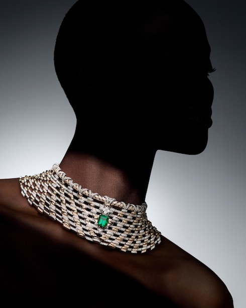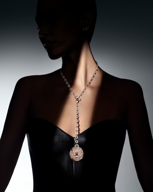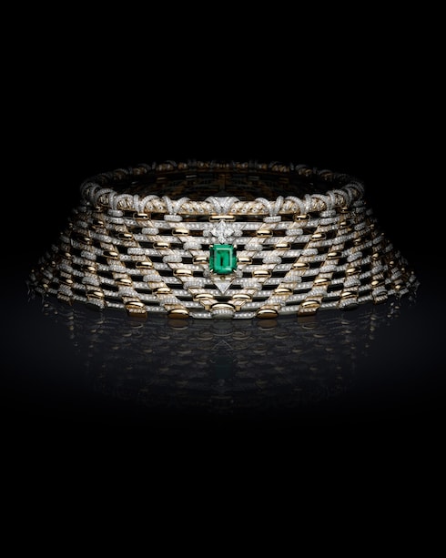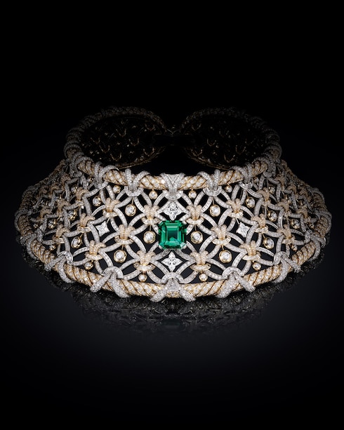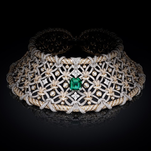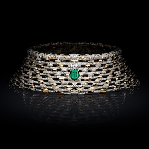 Séduction เผยให้เห็นความสลับซับซ้อนอันงดงามเหนือความคาดหมายซึ่งสะท้อนความเชี่ยวชาญด้านการรังสรรค์ผลงานการถักทอที่แผ่ขยายออกไปทั่วทั้งชิ้นงาน รายละเอียดที่แสนเลอค่าผ่านดีไซน์ในรูปตัว V รวมไปถึงการเก็บขอบในแบบเกลียวเชือก และลวดลาย Monogram Kite ชวนให้นึกถึงเอกลักษณ์อันเป็นตำนานของเมซงที่ผสานรวมอยู่ในสร้อยคอที่แสนงดงามน่าประทับใจมากที่สุดชิ้นหนึ่งในคอลเลคชั่นนี้ สร้อยคอโดดเด่นด้วยมรกตแซมเบีย 12.92 กะรัตที่งดงามเหนือคำบรรยาย ผ่านการรังสรรค์ผลงานที่ใช้เวลารวมทั้งสิ้น 4,200 ชั่วโมง