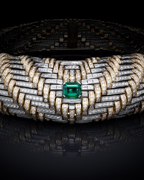 ความงดงามที่สอดประสานอย่างสมบูรณ์แบบของโครงสร้างที่ถักทอร้อยเรียงได้รับการถ่ายทอดลงในผลงาน Phénoménal ที่มีการดีไซน์แบบไขว้ผ่านอัญมณีพลาตินัมสองสีและเยลโลวโกลด์ เพชรลวดลายโมเสคที่แสนเลอค่าขับเน้นสัญลักษณ์รูปตัว V ในการจัดวางองค์ประกอบโค้งมนที่แสนหรูหราโอ่อ่าสะท้อนถึงความนุ่มนวลอ่อนโยนที่น่าประทับใจ