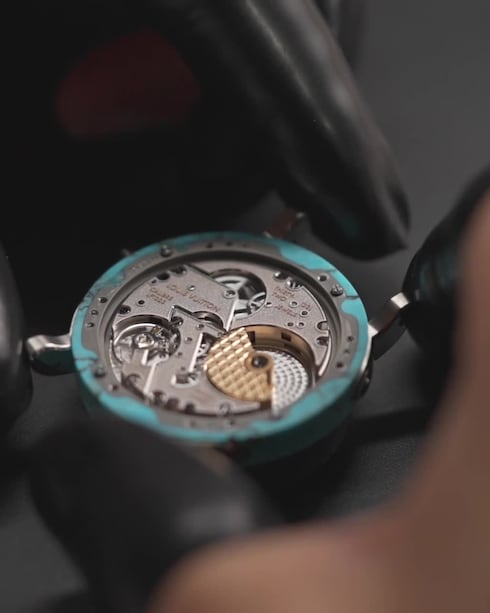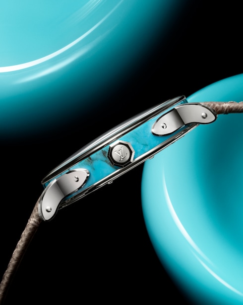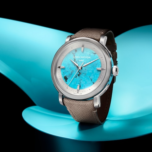 Louis Vuitton Escale Turquoise ผสานหน้าปัดและตัวเรือนตรงกลางจากอัญมณีสีฟ้าสดใส ซึ่งตัดจากสายแร่เลอค่าชิ้นเดียวกันที่ให้ลวดลายธรรมชาติอันงดงามล้ำลึกเพื่อให้นาฬิกาแต่ละเรือนมีเอกลักษณ์เฉพาะตัว นาฬิกาขนาด 40 มม. รุ่นนี้สะท้อนความเชี่ยวชาญทางเทคนิคของ La Fabrique des Boîtiers ซึ่งเป็นเวิร์กช็อปของหลุยส์ วิตตองในนครเจนีวาที่อุทิศให้กับศิลปะแห่งการรังสรรค์โครงสร้างตัวเรือนชั้นสูง