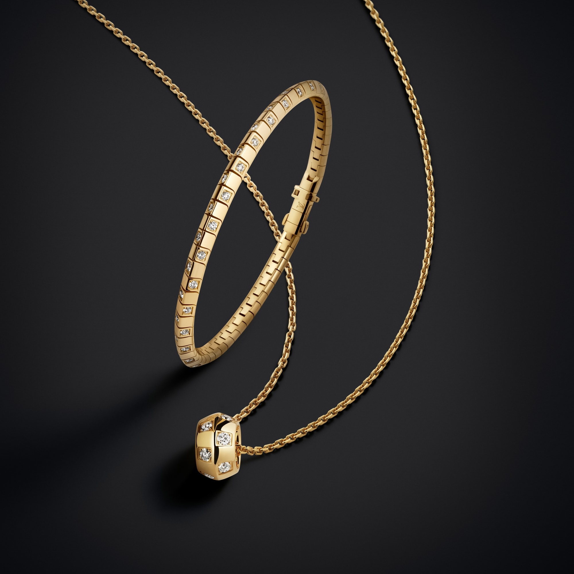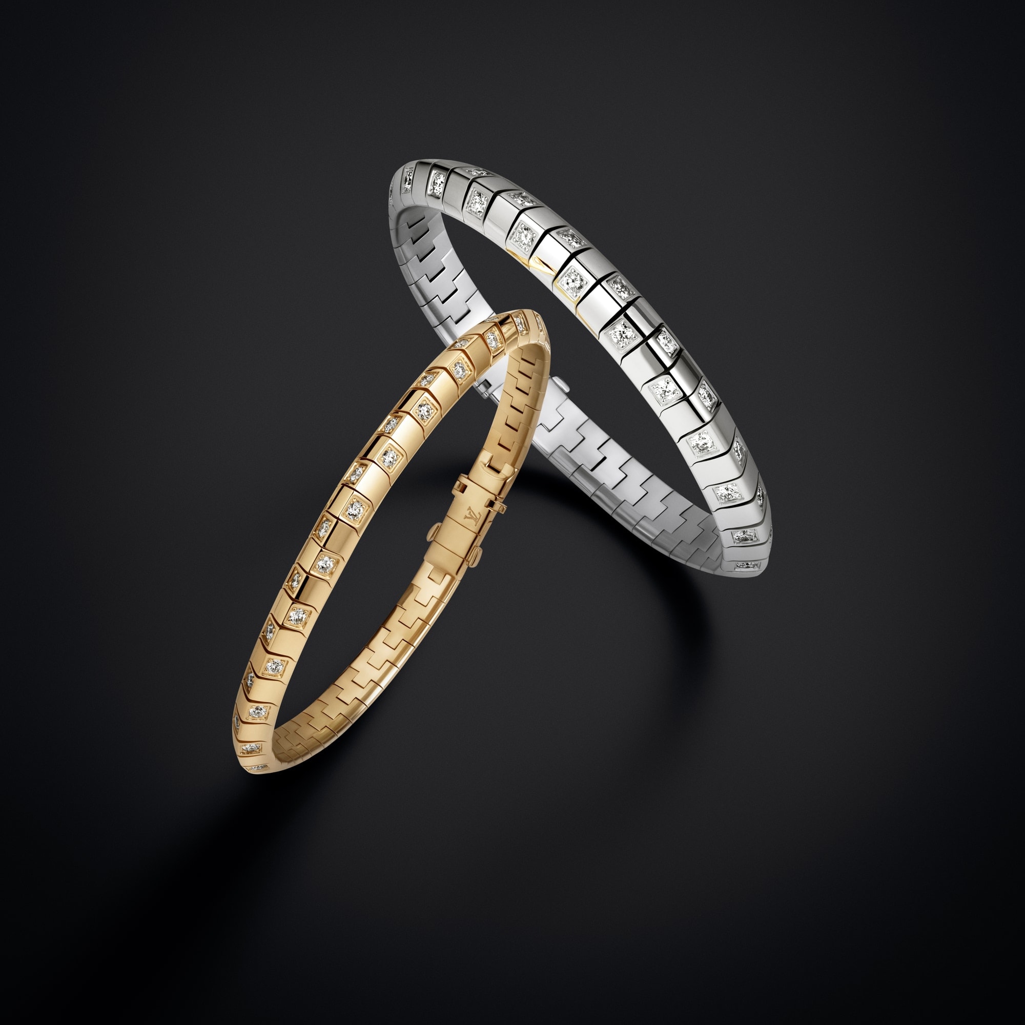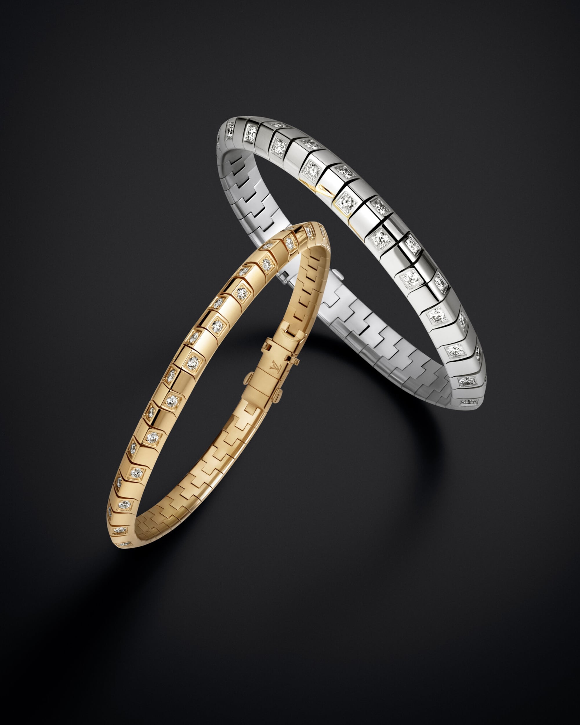 ลวดลาย Damier อันเป็นเอกลักษณ์ปรากฏอยู่อย่างชัดเจนบนสร้อยข้อมือเทนนิสที่ได้รับการตีความครั้งใหม่ให้เผยถึงความหรูหราแบบโมเดิร์น ผ่านการสลับเรียงเม็ดอัญมณีสี่เหลี่ยมจัตุรัสอย่างทองคำและเพชร เพื่อชวนให้รู้สึกถึงความเคลื่อนไหวไม่หยุดนิ่งอยู่เสมอ
