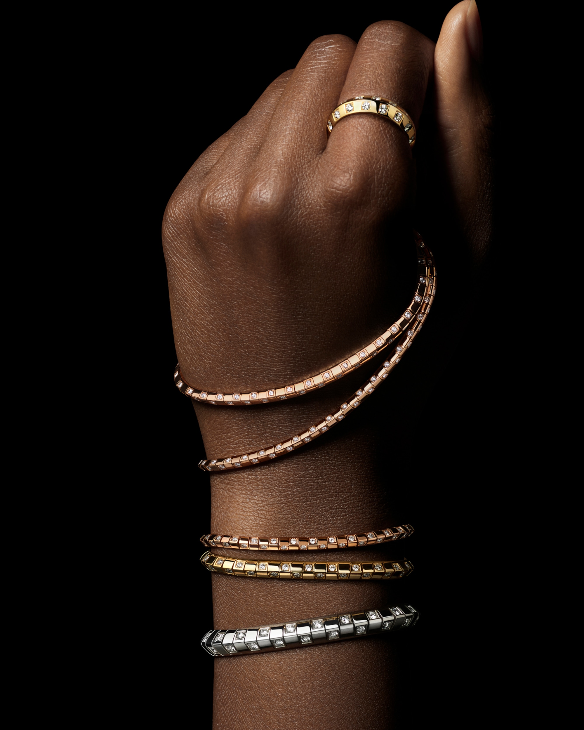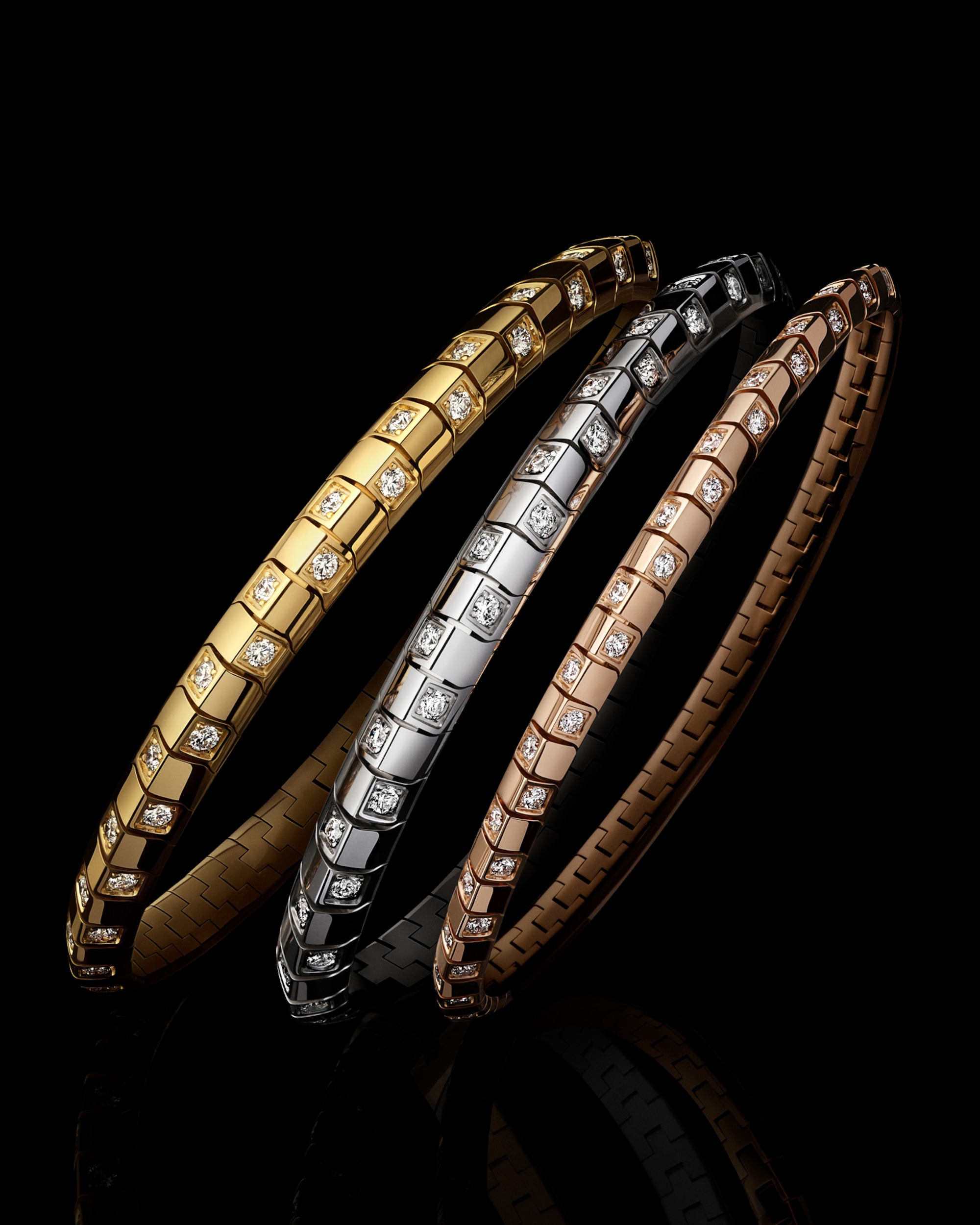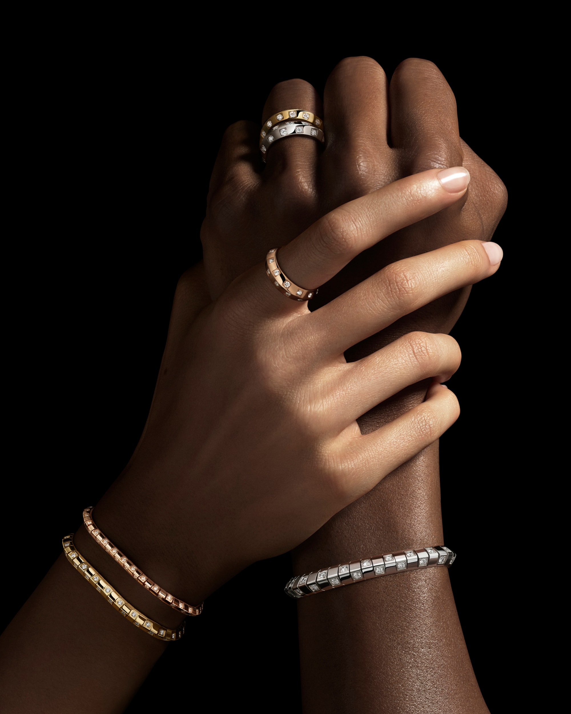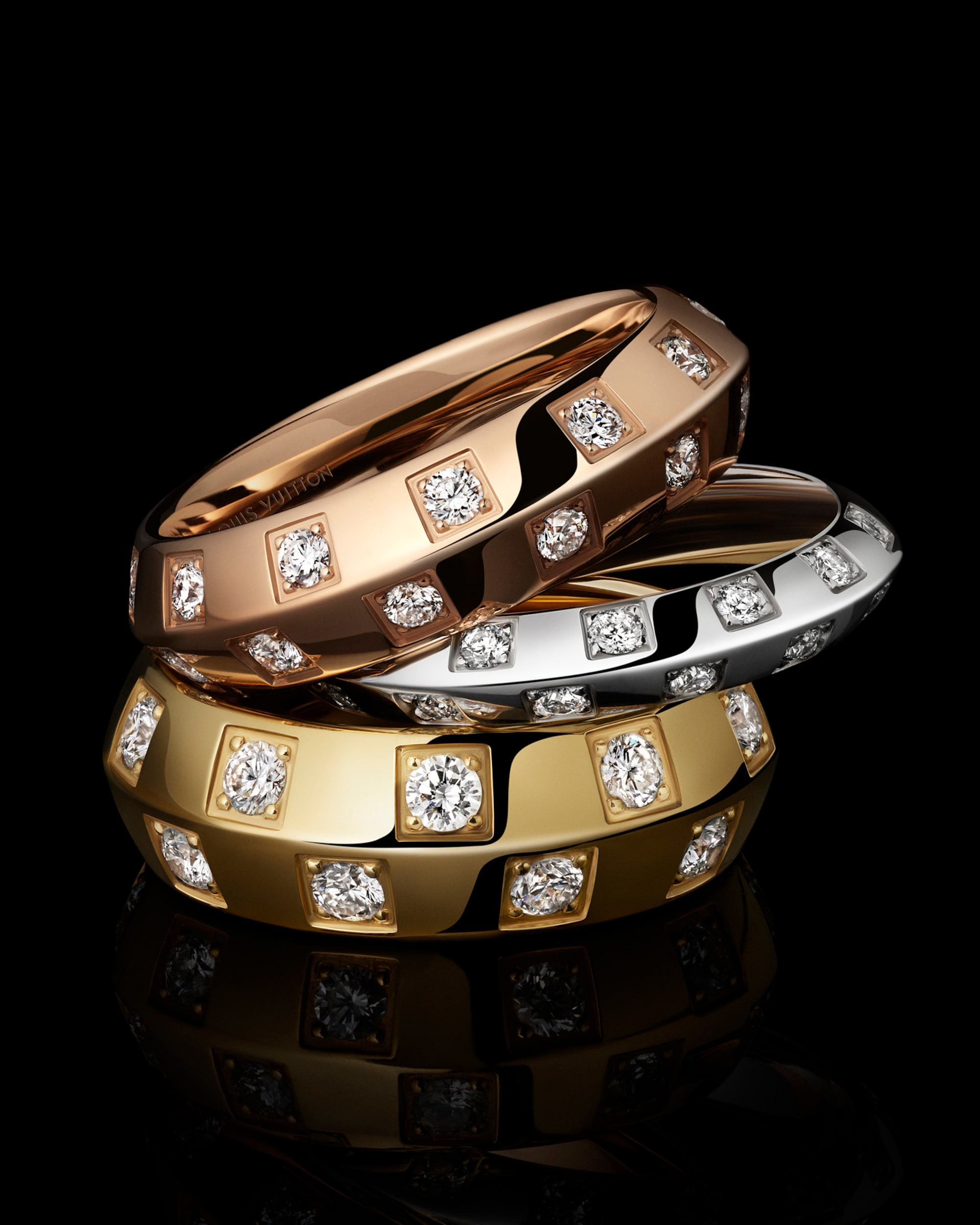 การออกแบบที่ลื่นไหลและเปี่ยมไปด้วยความหรูหราเหนือใครของเยลโลว์โกลด์ ไวท์โกลด์ หรือโรสโกลด์ และเพชร มาในความกว้าง 3 ขนาดจึงสามารถเลือกสวมใส่พร้อมกันได้เพื่อเพิ่มความงดงาม